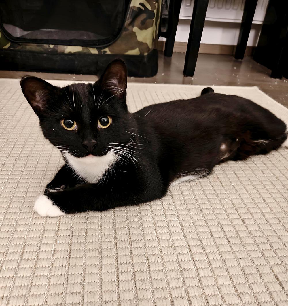 Arviolta 5-6 kk ikäinen Iiriksellä on valkoinen kolmiokiila kasvoillaan. Turkki on mustavalkoinen. Iiris on leikkisä, monenlaiset hippaleikit ovat hänen suosikkejaan. Laservaloa on myös kiva jahdata. Välillä hän hakeutuu siskonsa kylkeen ja ilmoittaa, että haluaisin pesut kaverilta. Ihmisten suhteen Iiris vielä vähän jännittää kosketusta. Välillä häntä saa jo varovasti silittää, kunhan käsi tulee takaa eikä suoraan kohti. Mutta on kiinnostunut ihmisen tekemisistä ja tulee ihan lähelle pyörimään. Raakaruokaan Iiriksellä on imtohimoinen suhde. Silloin voi toisille vähän murista, ettei kukaan vaan vie hänen saalistaan.