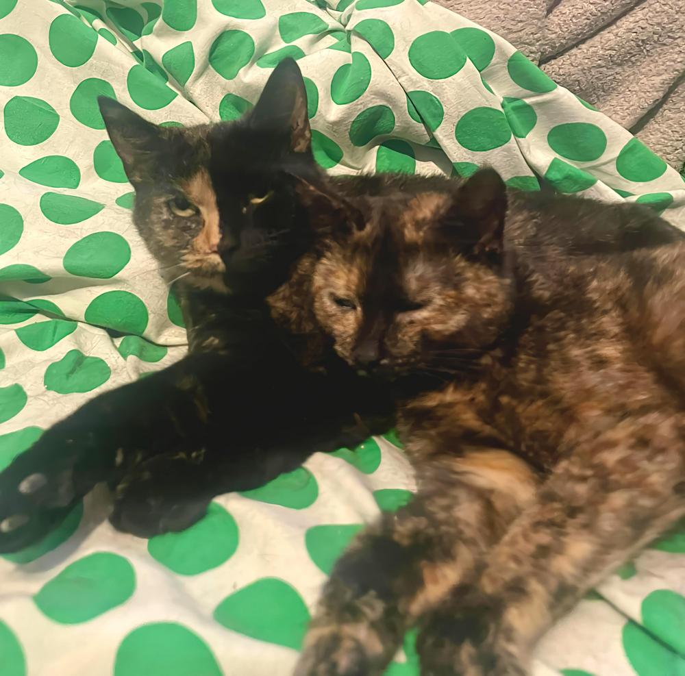 Nämä luovutetaan yhteiseen kotiin, sillä ovat luultavasti siskoksia ja näin ollen olleet yhdessä alusta asti. Nukkuvat ja leikkivät yhdessä. Molemmat tulevat toimeen myös sijaiskodin omien kissojen kanssa, ja ainakin koiran äänet ovat näille tuttuja. Tytöt ovat vielä nuoria ja siksi leikkisiä. Tykkäävät leikkiä esimerkiksi palloilla ja kaikenlainen jahtaaminen kiinnostaa.