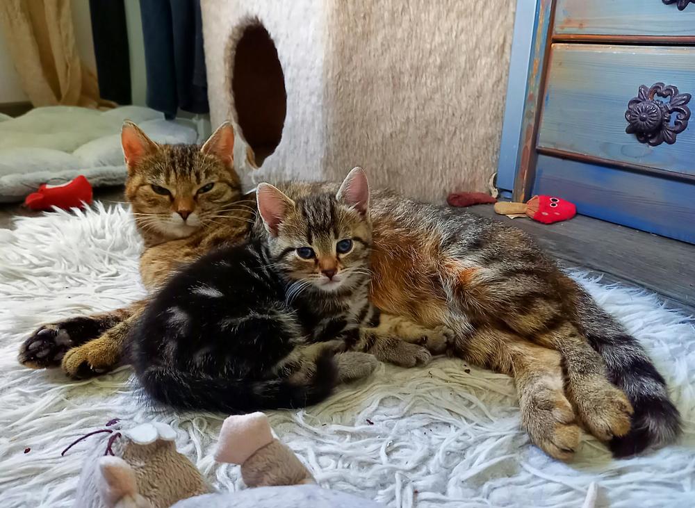 Noin 1-vuotiaat tumma kilppari Pirjo ja ruskeatiikeri Liisa tulivat sijaiskotiin Ilmajoelle keväällä. Nälkäiset ja pienikokoiset tytöt oli loukutettu populaatiosta. Molempien masut pömpöttivät siihen malliin, ettei kyse ollut ylensyönnistä vaan pentumasuista.