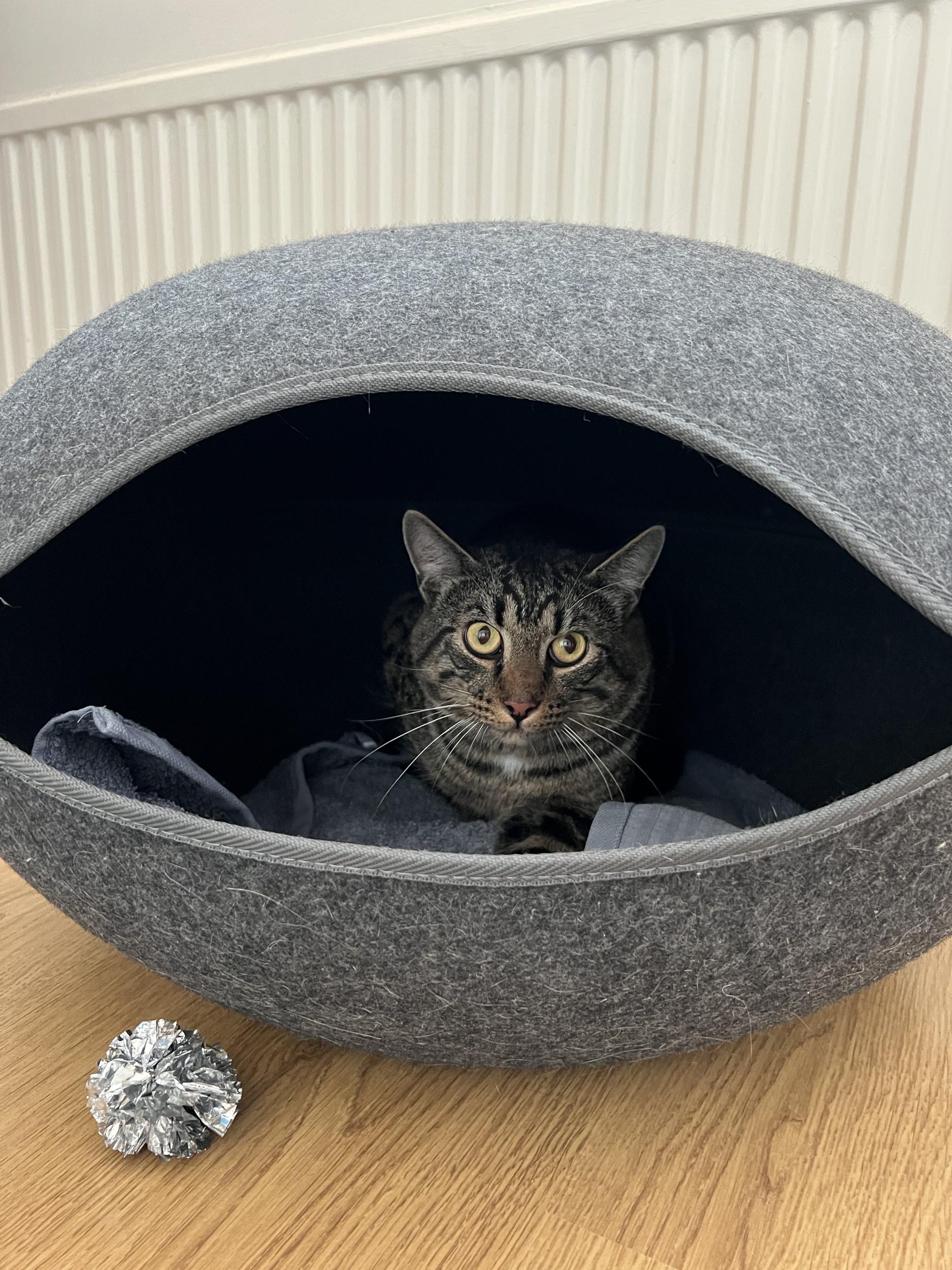 Aluksi Veeti oli hyvin jännittynyt ja sähisi lähelle tulevalle ihmiselle. Rauhallisen tutustumisen jälkeen ensimmäinen lyhyt silitys muutti tilanteen täysin. Veeti silminnähden rentoutui ja huomasi, että ihmisen kosketus tuntuukin mukavalta. Nyt ollaankin jo siinä tilanteessa, että iltaisin tämä suloinen poika hakeutuu itse syliin kehräämään nauttien huomiosta. Veeti tykkää myös kovasti jutella ja äännellä joko itsekseen tai ihmiselle.