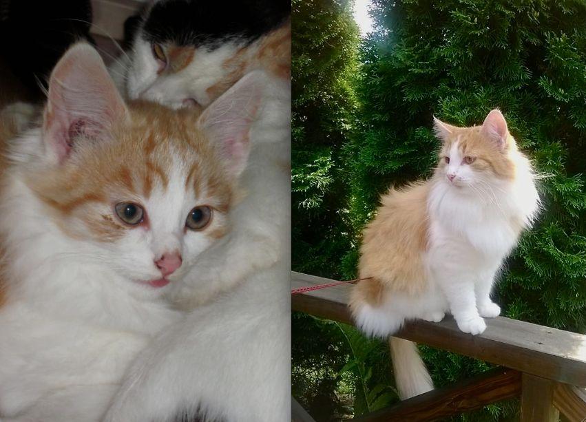 Reipas pikkumies pääsi muuttamaan ikiomaan kotiin heti luovutusikään ehdittyään ja kun pojan valtaisa korvapunkkiriesa oli selätetty ja silmätulehdus oli hoidettu kuntoon. Oikeanpuoleisessa kuvassa nuorimies, nykyään Onni-nimisenä tunnettu hurmuri, on ulkoilemassa komeasti valjaat päällä tasan kaksi vuotta myöhemmin. Onni viettää nyt onnellisia kissanpäiviä rakastettuna perheenjäsenenä, mukavan Maija-kissan kaverina.