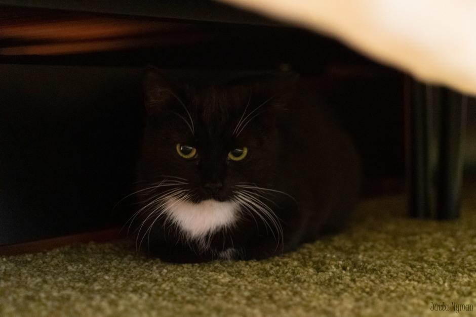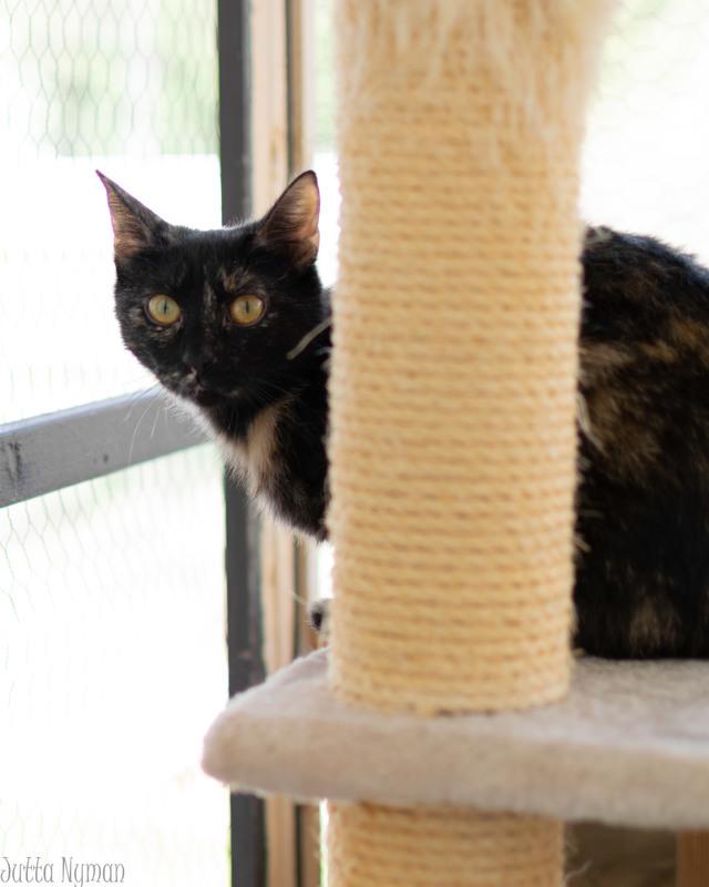 Mitä kiipeilyyn tulee, Jasmin viihtyy korkeuksissa: Kirjahyllyn päällä, kiipeilypuussa, riippumatossa seinällä... Etenkin kun imuri kaivetaan esiin, hän kiipeää mielellään nopeasti pois tieltä.