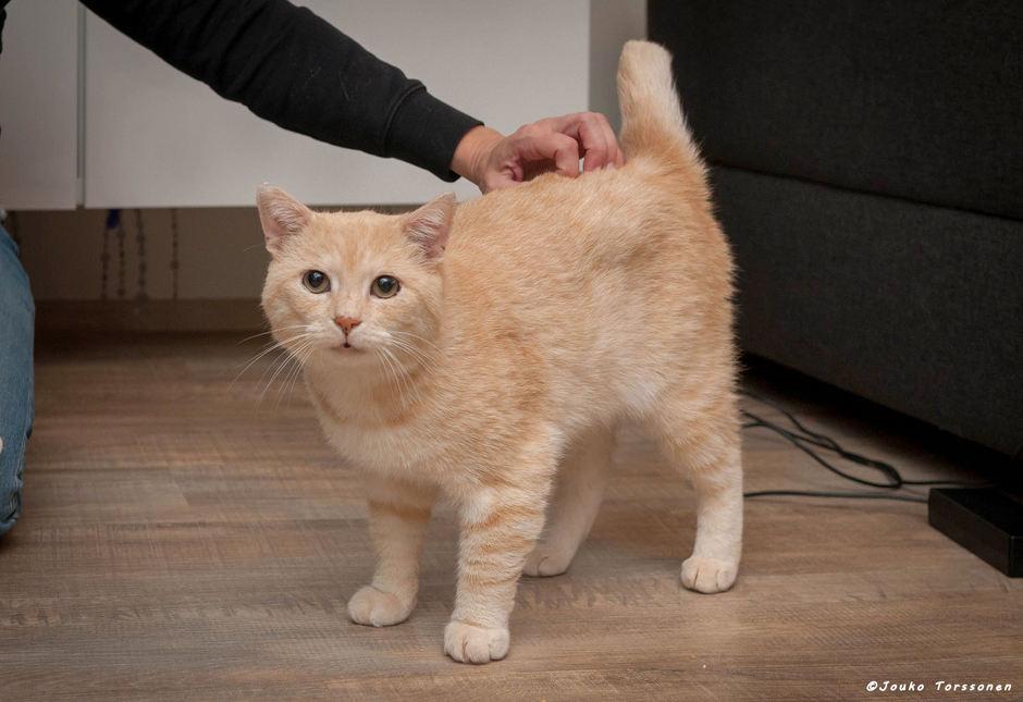 Aikaisemmasta kovasta elämästä kertovat myös muutama puuttuva hammas ja yksi kynsi. Hännästäkin on pätkä pois ja yksi varvas ei mene kippuralle. Näistä vanhoista ja hoidetuista pikkuvammoista huolimatta Kerrrmatassu kiintyy todella tiukasti hoitajaansa ja rakastaa lujasti.