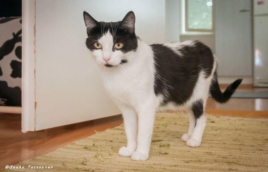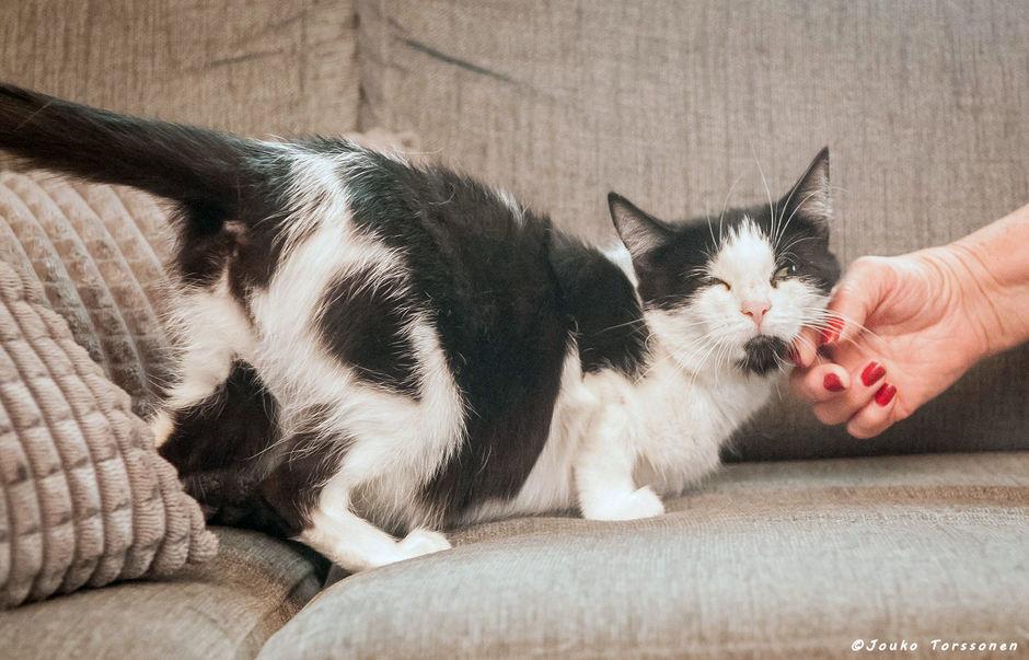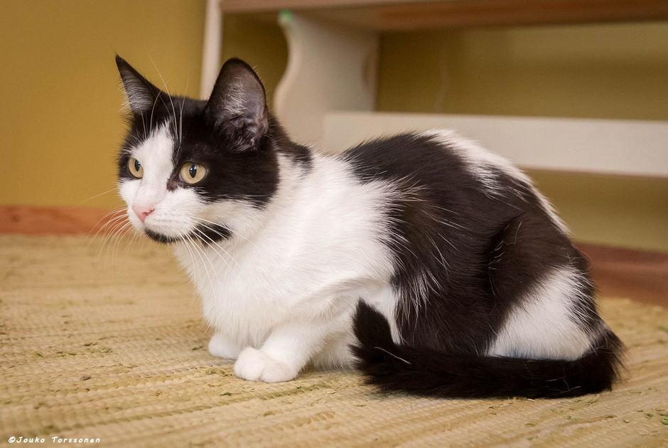 Tämä pienikokoinen, mustavalkoinen ikäarviolta 5-6 vuotta vanha emokissa
