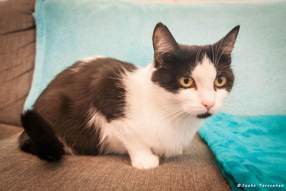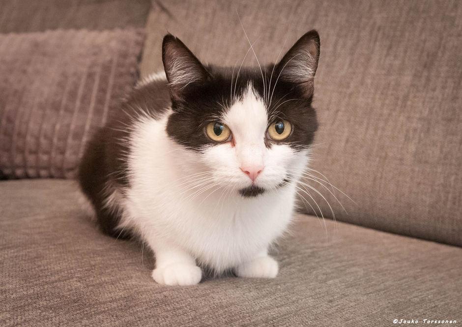 Tämä pienikokoinen, mustavalkoinen ikäarviolta 5-6 vuotta vanha emokissa