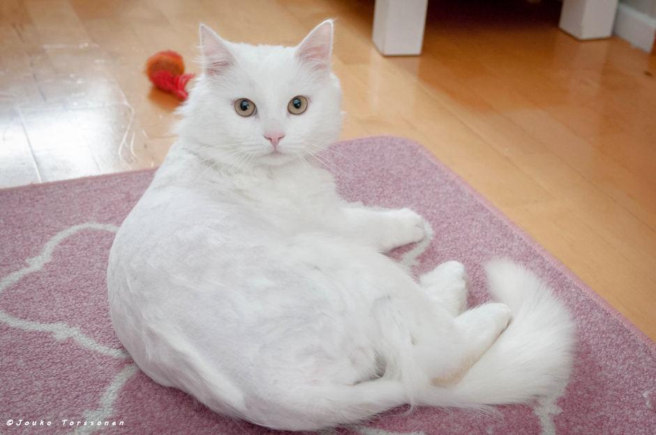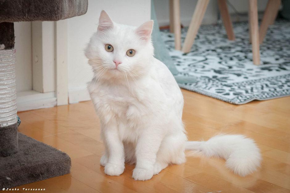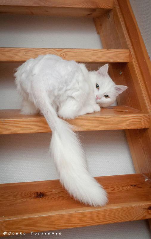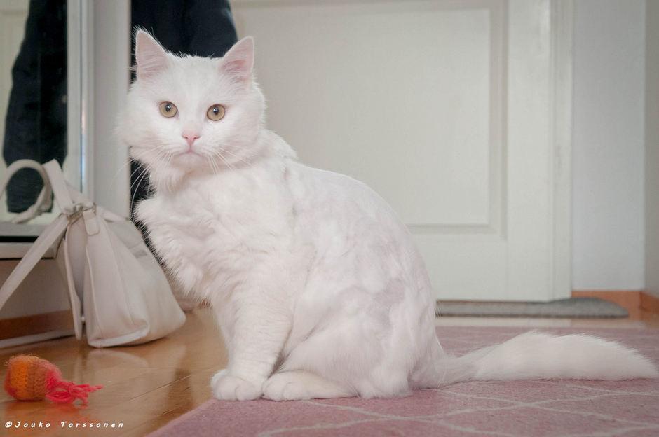 Tämä ihana, valkoinen kehruukone on vielä aika nuori ja palveluskunnan kantapäät ovat kivaa saalista, jos ei herraa jakseta leikittää. Parhaimmat leikit ovat pitkän karvamadon jahtaaminen ja portaissa juostaan vikisevän leluhiiren perässä. Amadeus osaa käyttää raapimapuuta kynsiensä teroittamiseen vielä paremmin, jos heiluttelee karvamatoa siinä kiinni.