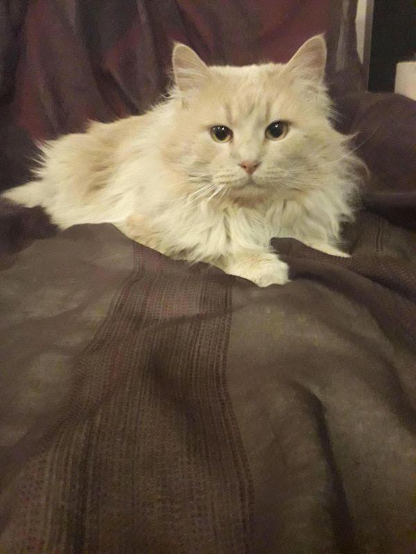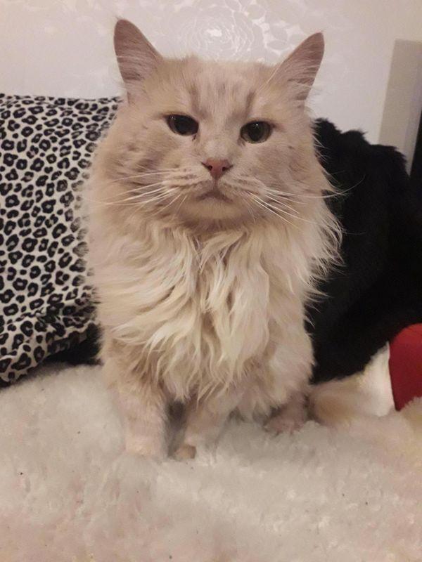 Hei, olen Herbert. Arvioitu ikäni on noin 3 vuotta. Loukutettu olen ulkoa ja Koiramäen majatalosta siirryin tänne sijaiskodin hoiviin. Ujostelin ensin sohvan alla. Lopulta rohkaistuin hakemaan rapsutuksia ja harjauksia, joista tykkään niin kovasti kehräyksen kera. Komea kerman sävyinen turkkini vaatiikin harjauksia säännöllisesti. Leluista en oikein piittaa, mutta ruokaa rakastan yli kaiken. Saatan jopa pikkuisen lempeästi näykkäämällä ilmoittaa, jos ruuan saamisessa kestää omasta mielestäni liian kauan. Muuten olen kiltti, en pure enkä raavi. Painankin mahtavat 6 kg. Yritän myös välillä huijata, etten ole ruokaa koskaan nähnytkään. Ruuan jälkeen otan aina pitkät nokoset, illalla seurustelen kyllä. Sylissä en oikein viihdy, mutta saatan makoilla sohvalla vieressä.