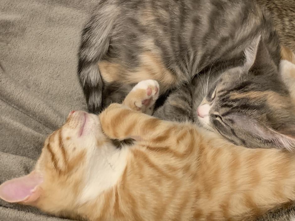 Öisin kolmikko nukkuu. Harvemmin on edes iltarallia kun ihmiset asettuvat sänkyyn, koska tekemistä on riittänyt jo päivällä. Nukkumaan käydään kolmistaan vierekkäin kiipeilypuuhun ja yön aikana siirrytään ihmisten sänkyyn jalkopäähän koko lauman kanssa. Läheisyys kissakaverin kanssa on tärkeää levätessäkin. Aamulla heräillään samaan aikaan kun ihmisten herätyskellot pärähtävät soimaan.