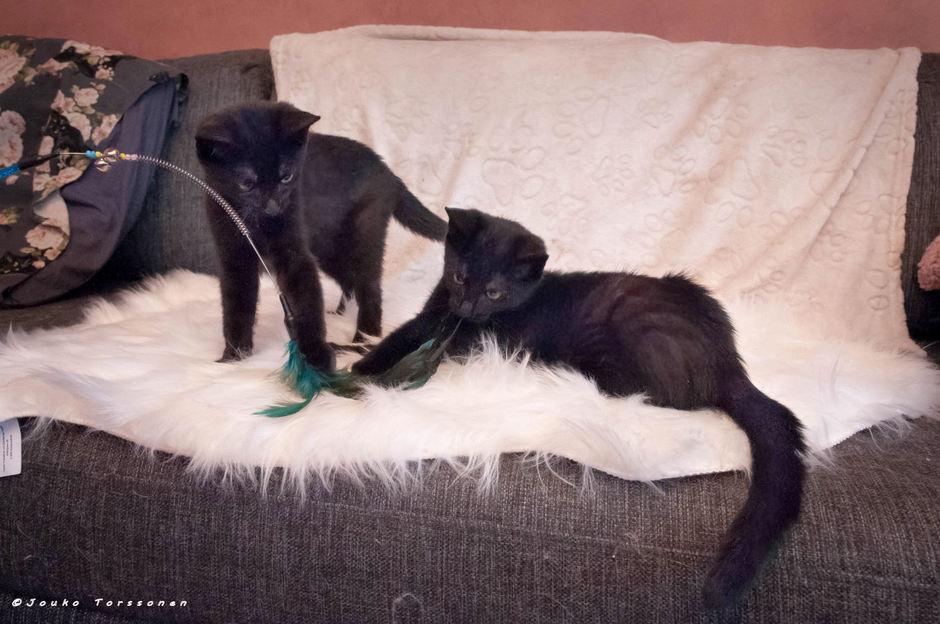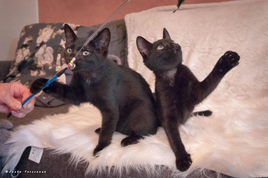Pennut ovat hyvin aktiivisia, joten uuden kodin tulee olla valmis aktivoimaan ja leikittämään pentuja useasti. Pennut leikkivät paljon myös itsekseen, sekä kaverikissan kanssa. Kissanmintulla täytetyt hiirilelut ovat ehdottomasti lemppareita. Siskokset voivat lähteä yhdessä omaan kotiin tai erikseen kissakaverilliseen kotiin.