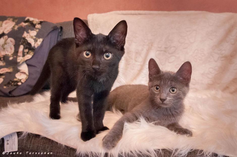 Näitä mustia siskoksia on hankala erottaa toisistaan, mutta Melody on kokonaan musta parilla valkoisella rintakarvalla, kun Esmeraldassa on vähän enemmän valkoista rinnuksessa. Siskokset ovat nyt 15 viikon ikäisiä eli yli luovutusiän.