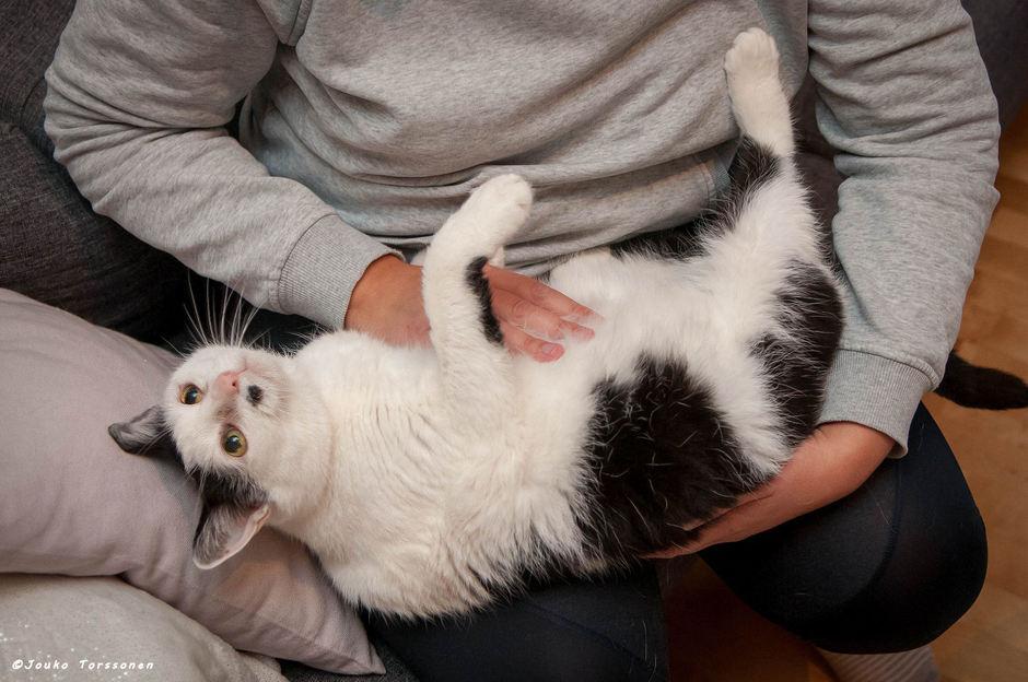 Lupsakka mies! Kaikista parasta on toisen päällä nukkuminen ja mahan silittelyt. Sijaiskodissa ollaan mukana jopa saunassa.