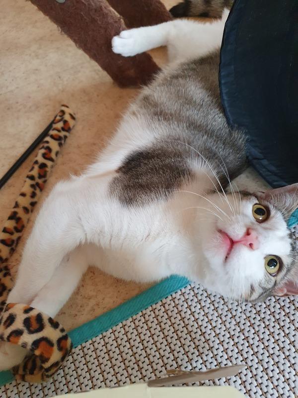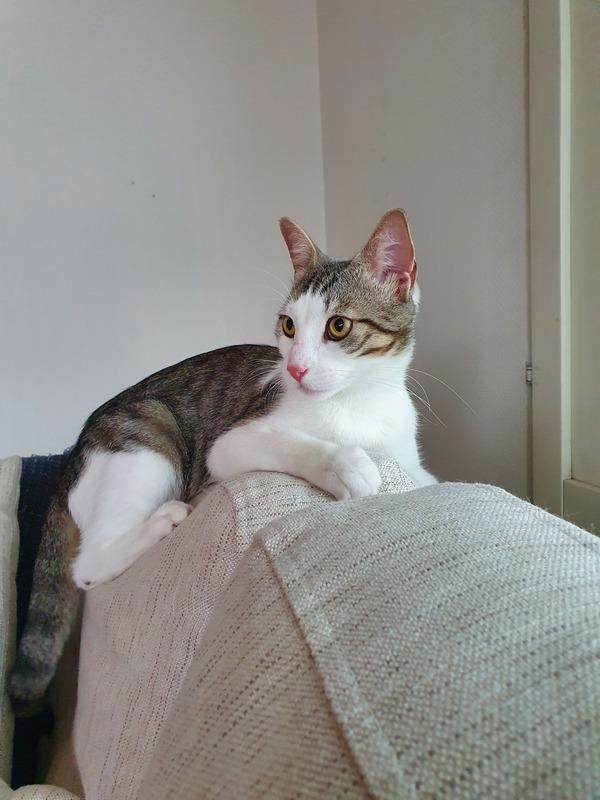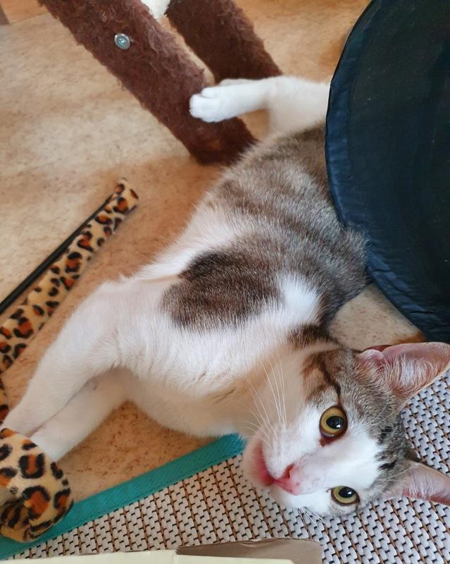 Ihastuttava noin 1 vuoden ikään ehtinyt ruskeatiikerivalkoinen Narri-neiti on valmis juoksentelemaan omaan kotiinsa.
