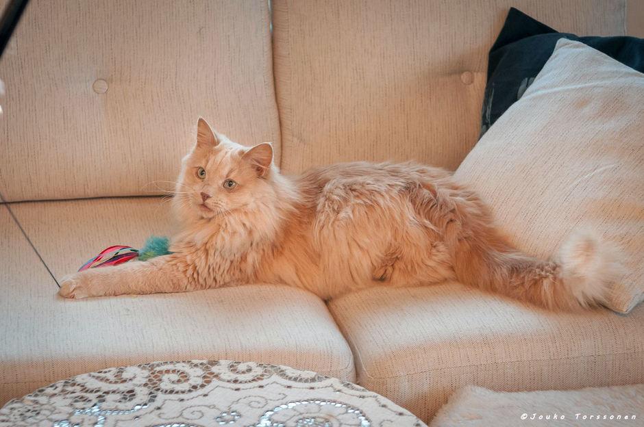 Sisu on myös aktiivinen ja leikkisä tapaus, ja hänellä on melko hallitseva persoonallisuus. Sijaiskodin muut kissat voivat vain koittaa antaa tilaa, kun tämä pörriäinen jyrää onkilelujen perässä kaikki alleen. Sisu on aina ensimmäisenä niin omalla kuin muidenkin ruokakupeilla, eikä ole moksiskaan, vaikka muut välillä sähisevätkin.