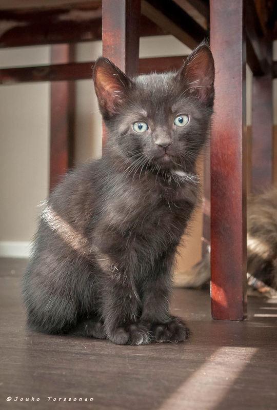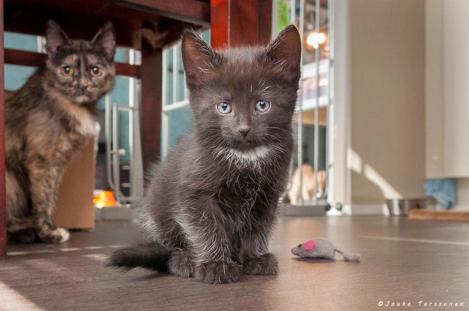 Perskärpäsinä kulkevat ihmisen perässä uteliaina joka paikkaan, joten sen takia suljetut ovet ei ole kivoja. Sijaiskodissa on totuttu aikuisten kissojen ja ison koiran seuraan. Varsinkin on hauskaa roikkua koiran hännässä ja pyöriä jaloissa. Koira huolehtii pesten poikien naamasta enimmät ruuanjämät.