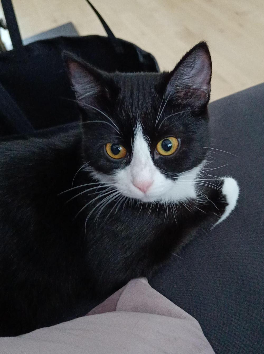 Selena on siskoaan ujompi ja varautuneempi ihmisen kosketukselle ja katsekontaktille. Sijaiskotiin tullessa Selena oli erittäin arka, ja kaunis mustavalkoinen tyttö onkin rohkaistunut niistä ajoista hurjasti. Kaikki uusi on kuitenkin Selenalle vielä epäilyttävää ja sängyn alla on paras turvapaikka. Sieltä on hyvä myös läpsiä sijaismamman varpaita.