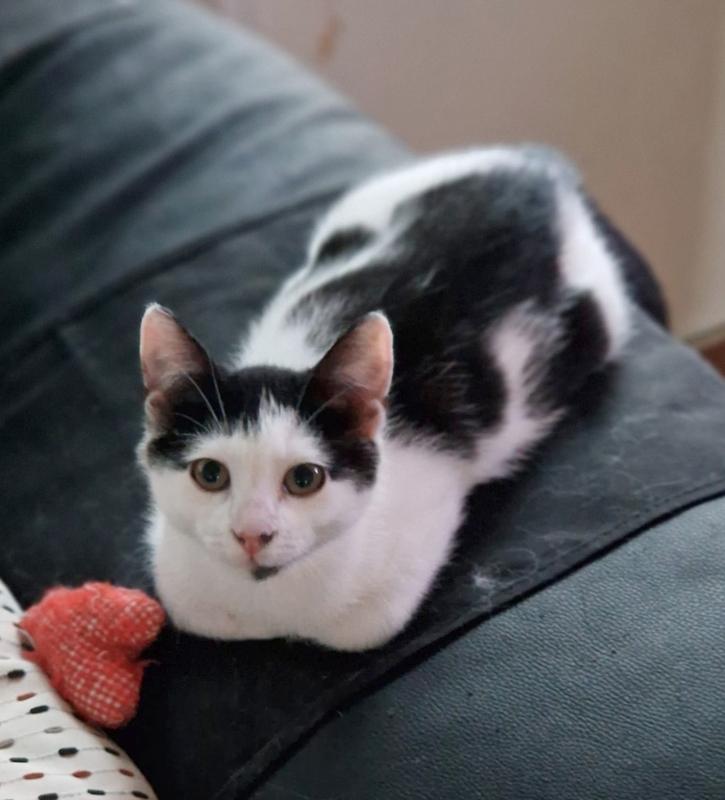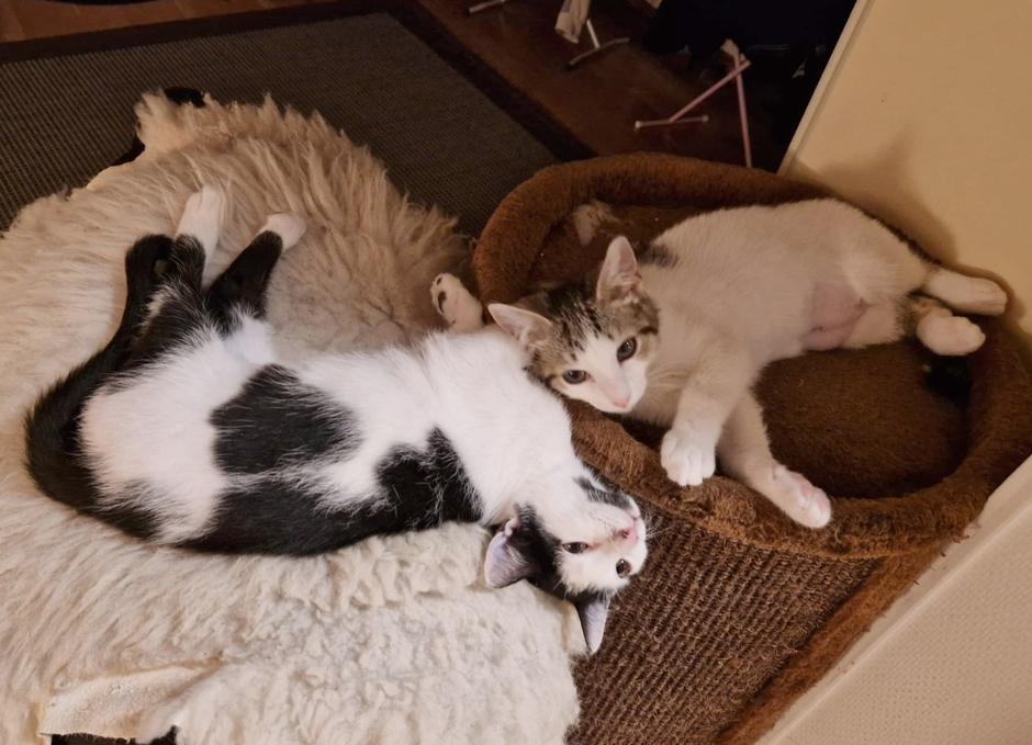Väritykseltään Estella on mustavalkoinen, Dinalla on valkoisella pohjalla ruskeatiikerilaikkuja. Molemmilla on otsassa hauska kuvio. Kissaneidit loukutettiin melko pienenä emonsa ja veljiensä kanssa. Molemmat ovat hyvin kesyyntyneet sijaiskodissa. Heitä saa rapsutella ja pitää sylissä.