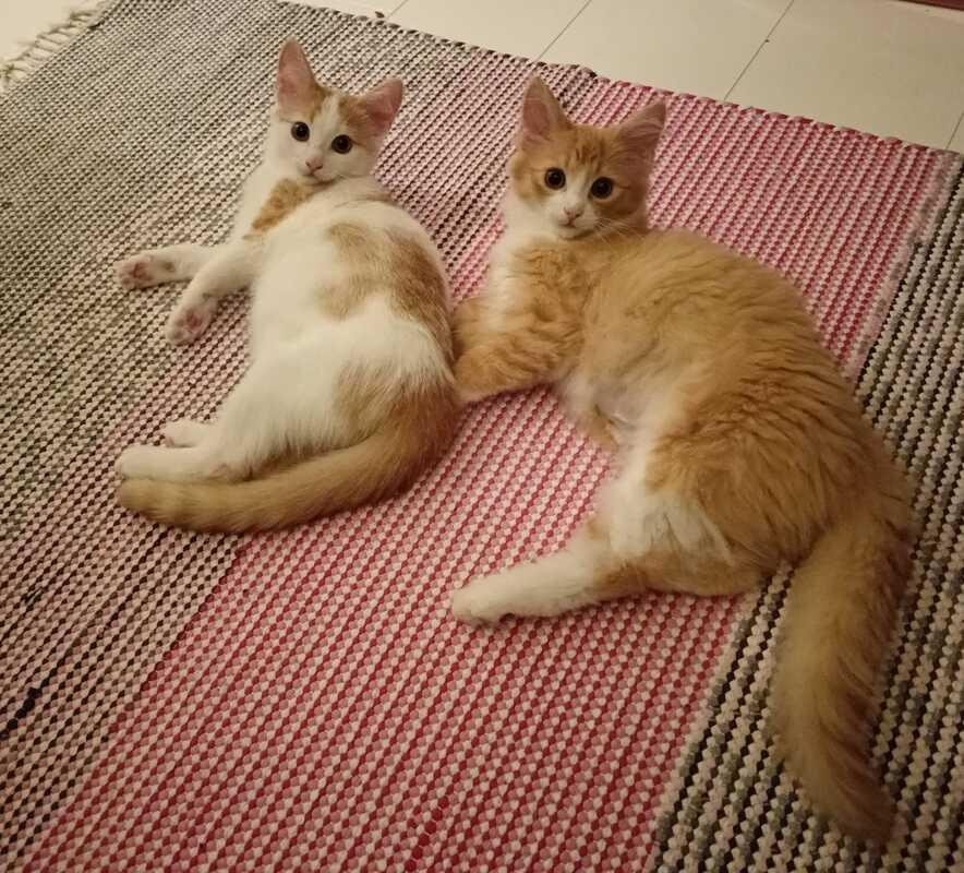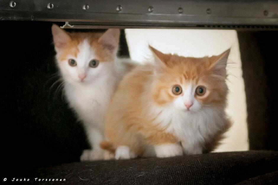 Nämä ulkovajasta muutaman viikon ikäisinä löytyneet nuoret kissanalut voisivat kotiutua niin lapsiperheeseen kuin rauhallisempaan aikuistenkin kotiin. Molempien oranssien palleroiden kynsien leikkuu ja lääkitseminenkin onnistuu helposti.