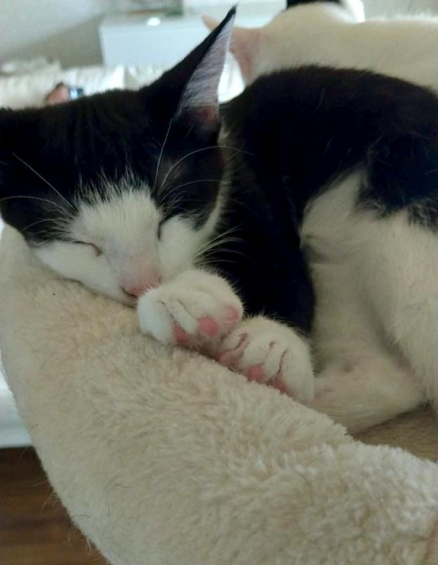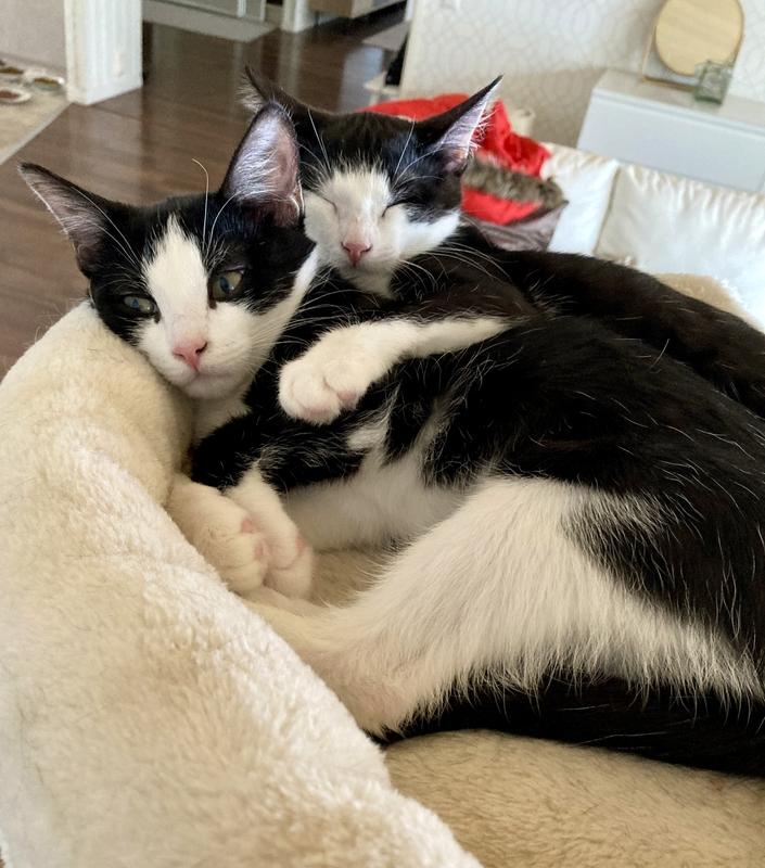 Ruokailut ja hiekkalaatikolla käynnit sujuvat molemmilta hienosti. Helmi ja Sannu luovutetaan moneen kertaan madotettuina, leikattuina, rokotettuina, sirutettuina ja Fiv/Felv-testattuina terveiksi.